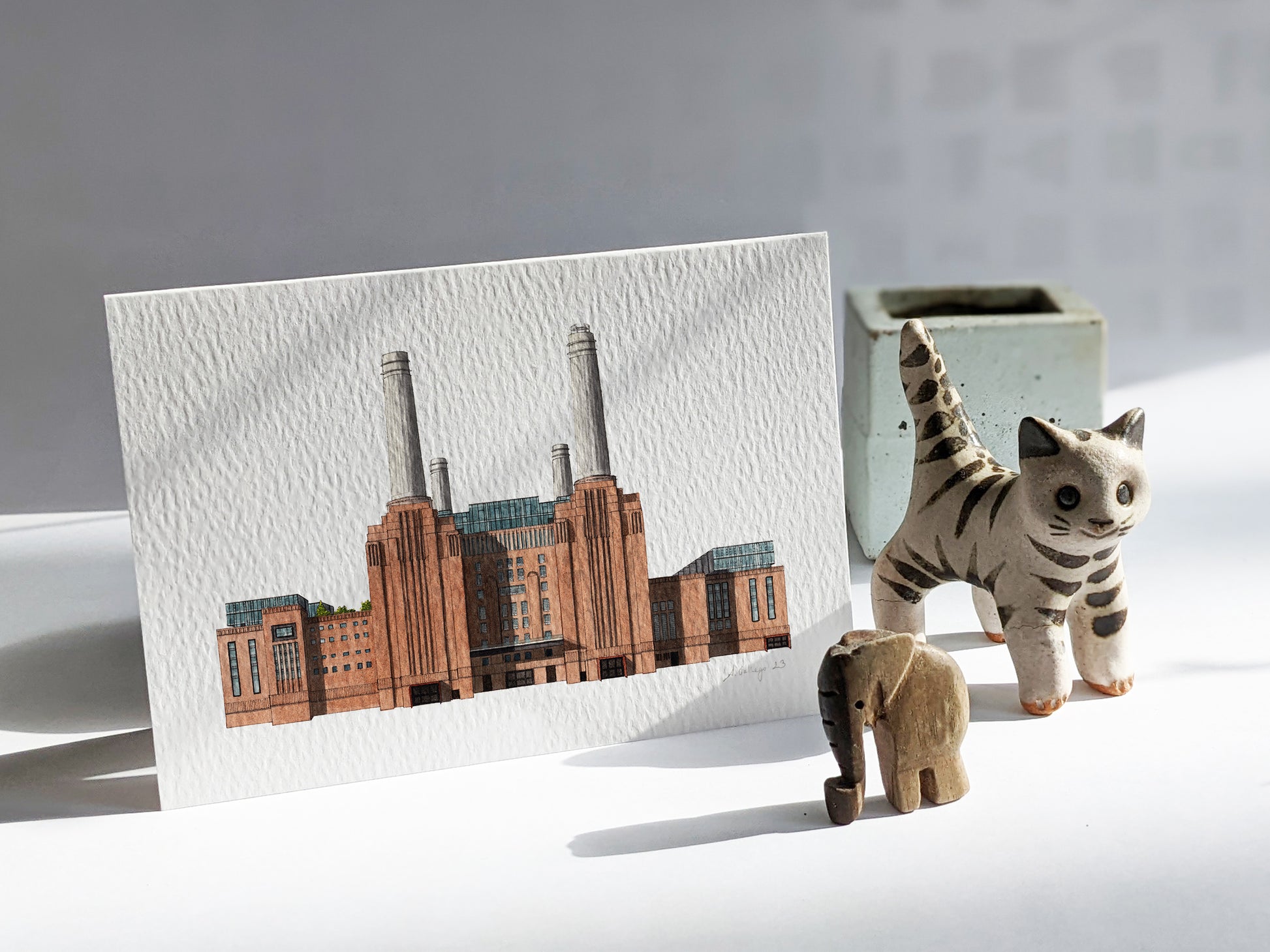 This is a greeting card of a watercolour illustration painted by me of the iconic Batterea Power Station in South London.