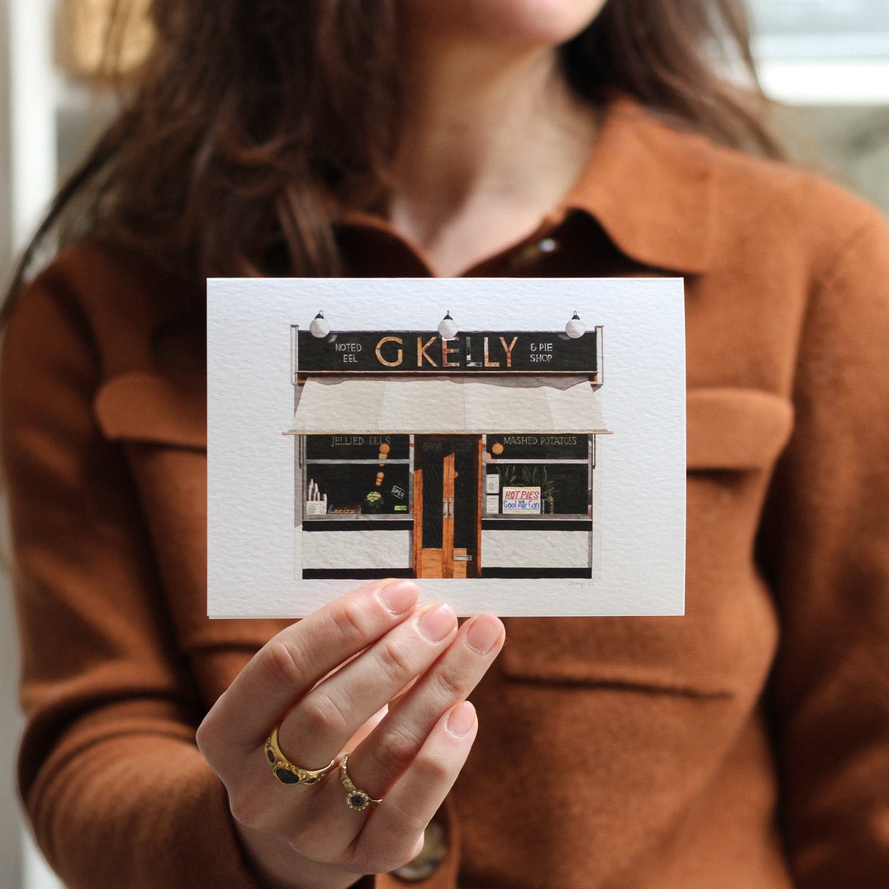 This is a greeting card of a watercolour illustration painted by me of the iconic G Kelly Pie & Mash shop in Bow / Mile End, East London.