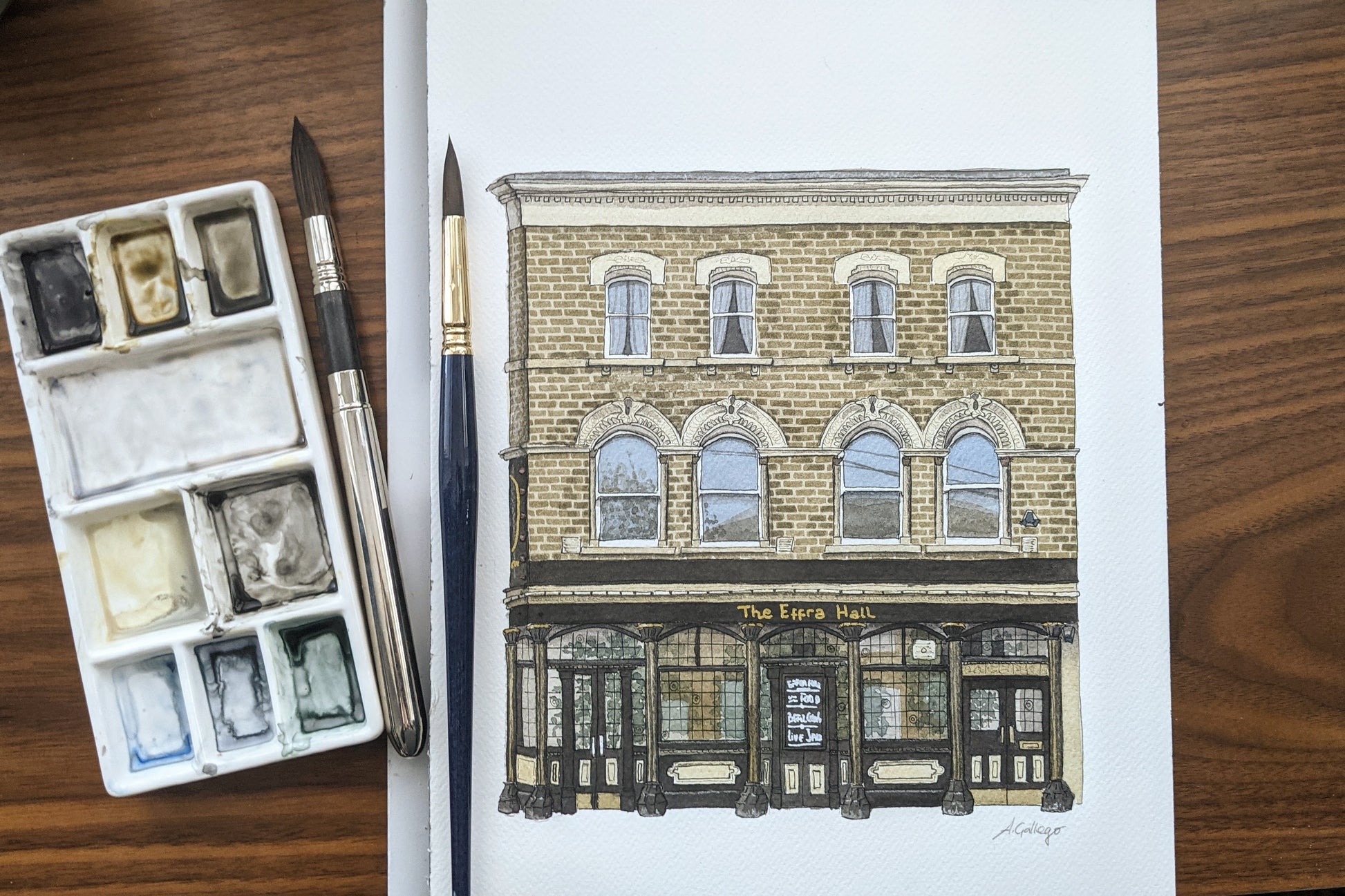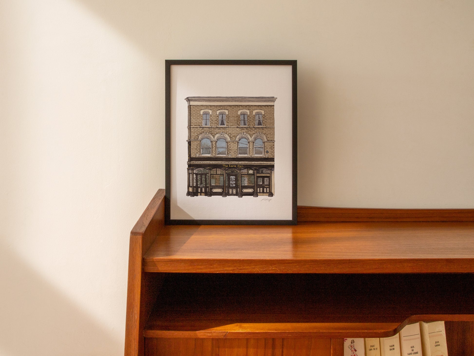 This is a Giclée Print of a watercolour illustration painted by me of the historic Effra Hall Tavern in Kellett Road in Brixton, South London. The Effra Hall is famous for its live music.
