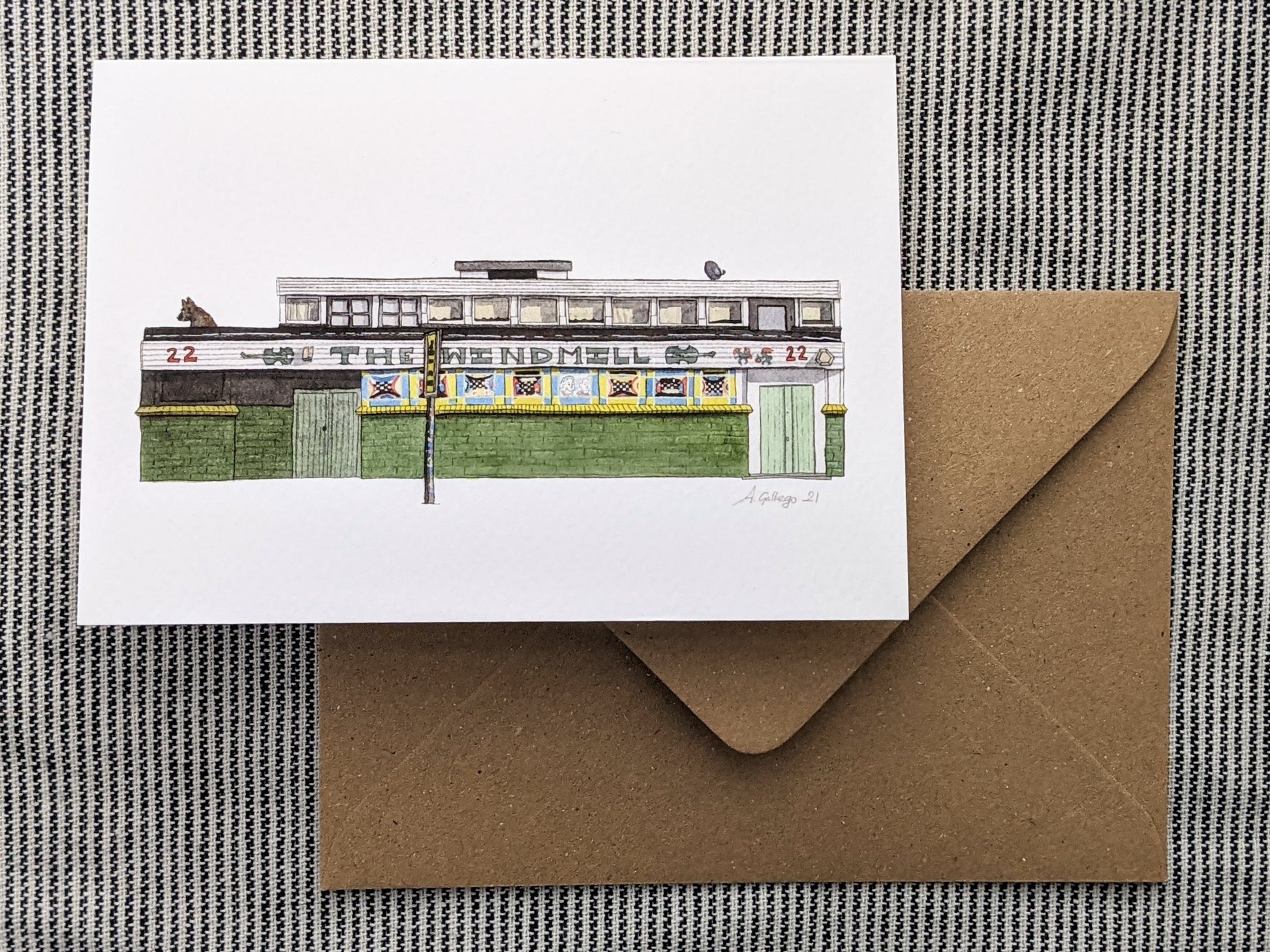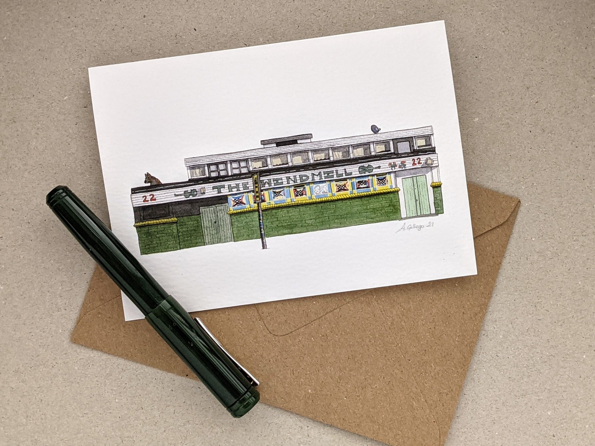 This is a greeting card of a watercolour illustration painted by me of the historic Brixton Windmill pub and music venueu in Brixton, South London.