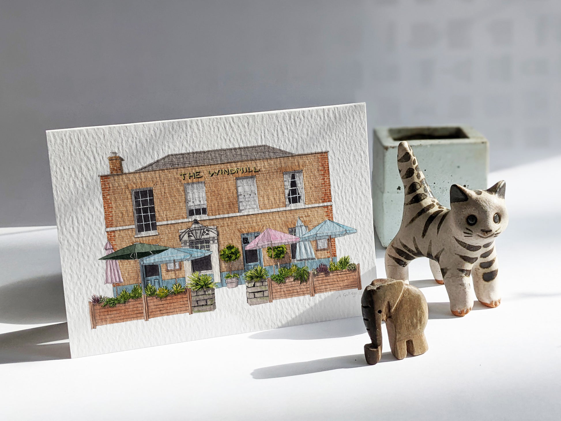 This is a greeting card of a watercolour illustration painted by me of the historic The Windmill, in Clapham Common, South London.