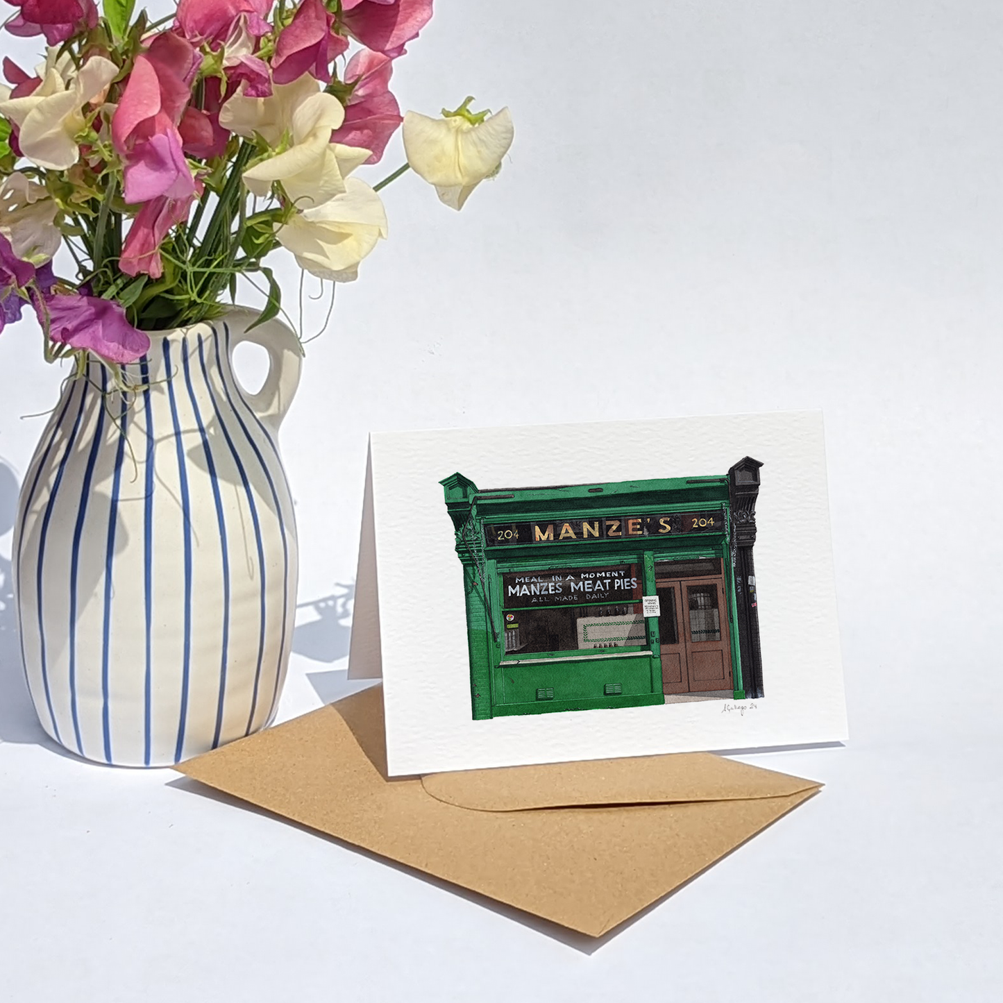 This is a greeting card of a watercolour illustration painted by me of Manze's Pie & Mash Shop in Deptford, South East London.
