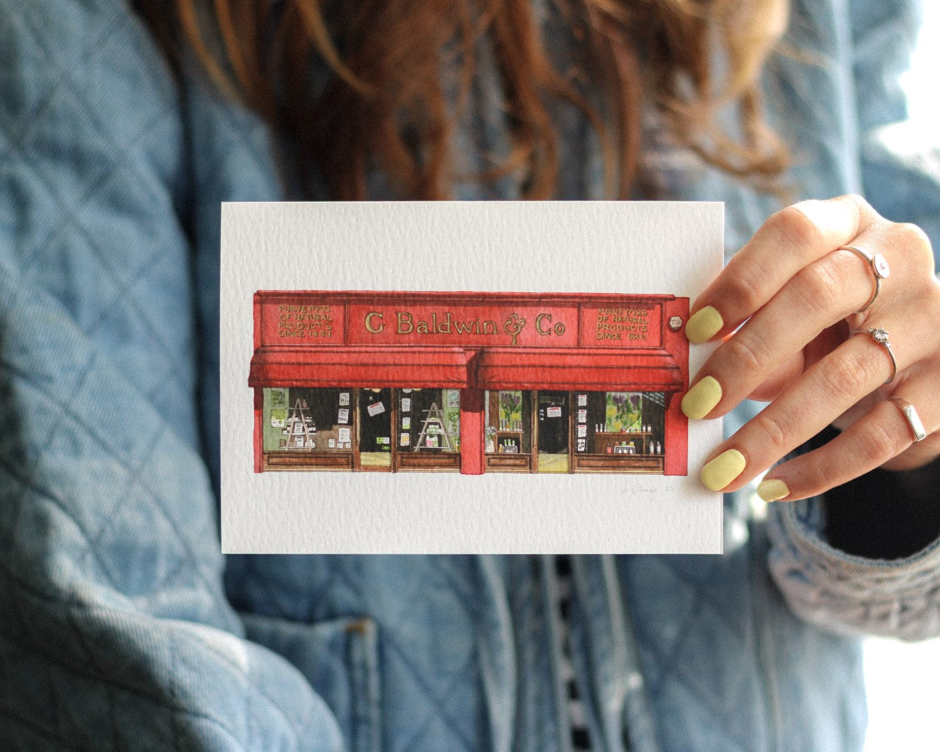 This is a greeting card of a watercolour illustration painted by me of the historic G Baldwin & Co apothecary in Walworth Road in Elephant & Castlem Southwark. London