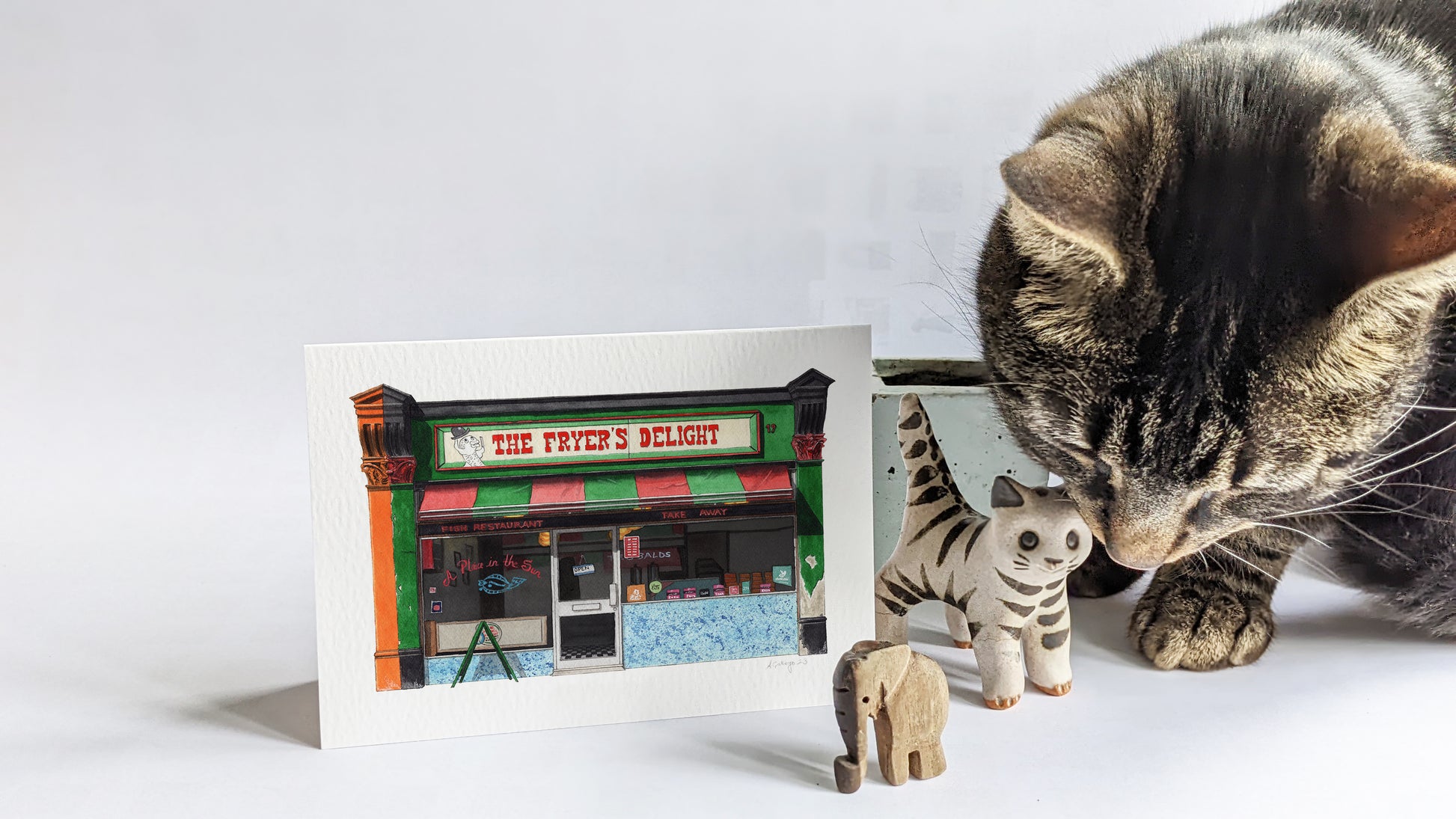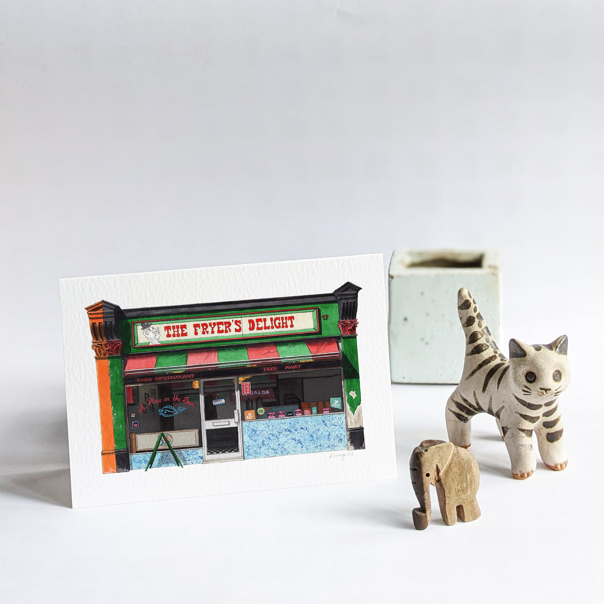 This is a digitally printed greeting card of a watercolour illustration painted by me of the iconic The Fryer's Delight, the fish and chip shop in Holborn, Central London.