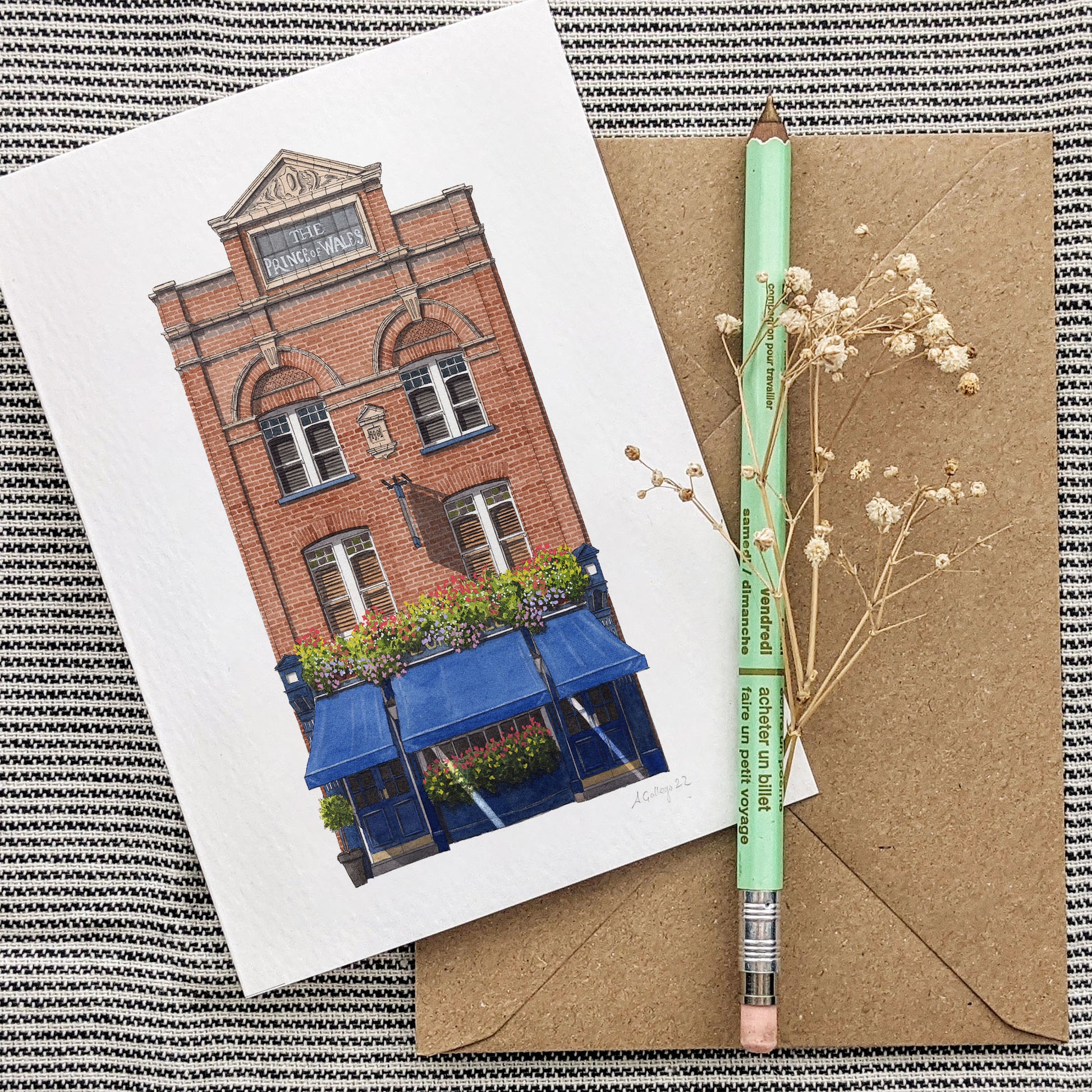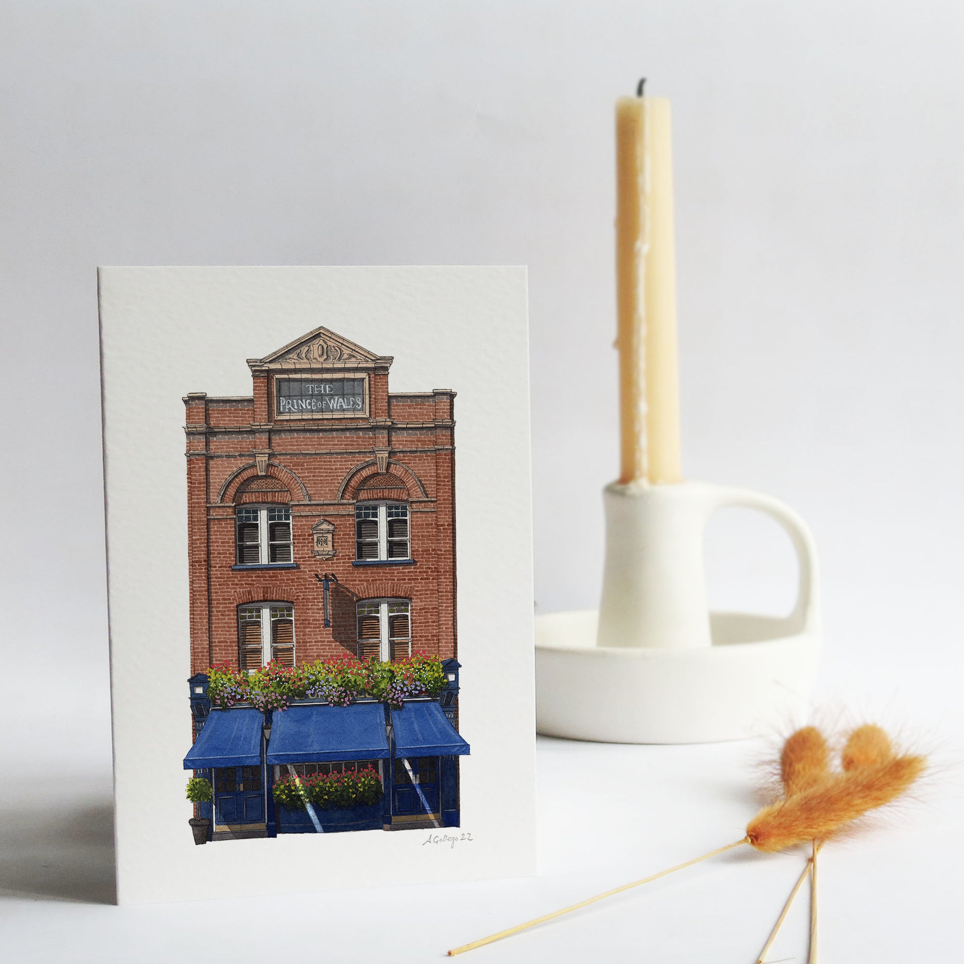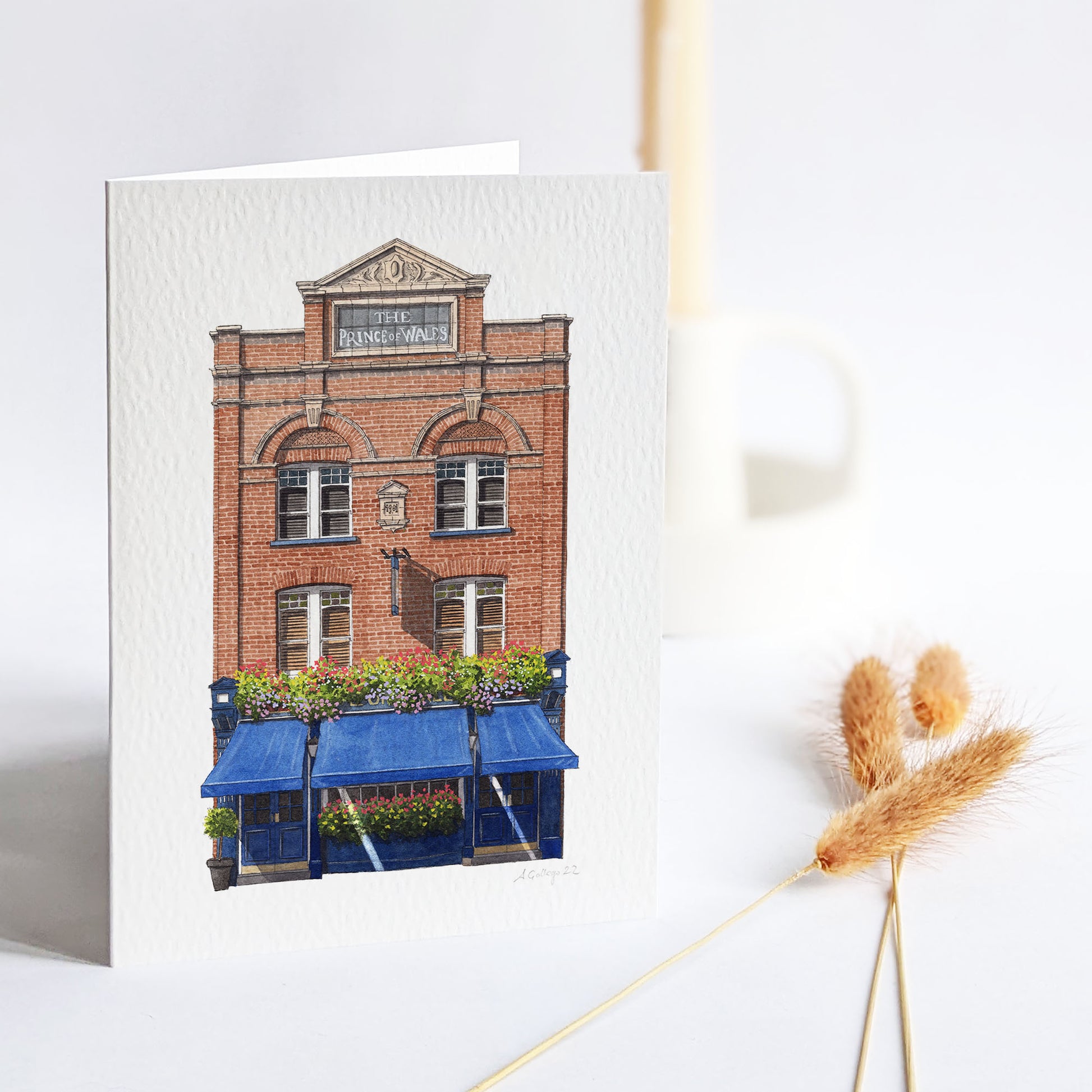This is a greeting card of a watercolour illustration painted by me of the historic The Prince of Wales pub in Kennington, South London.