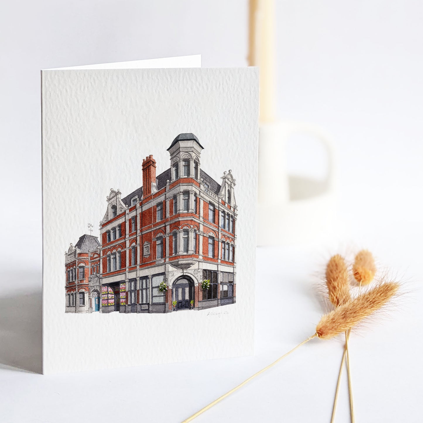 This is a greeting card of a watercolour illustration painted by me of the Loughborough Hotel, in South West London.