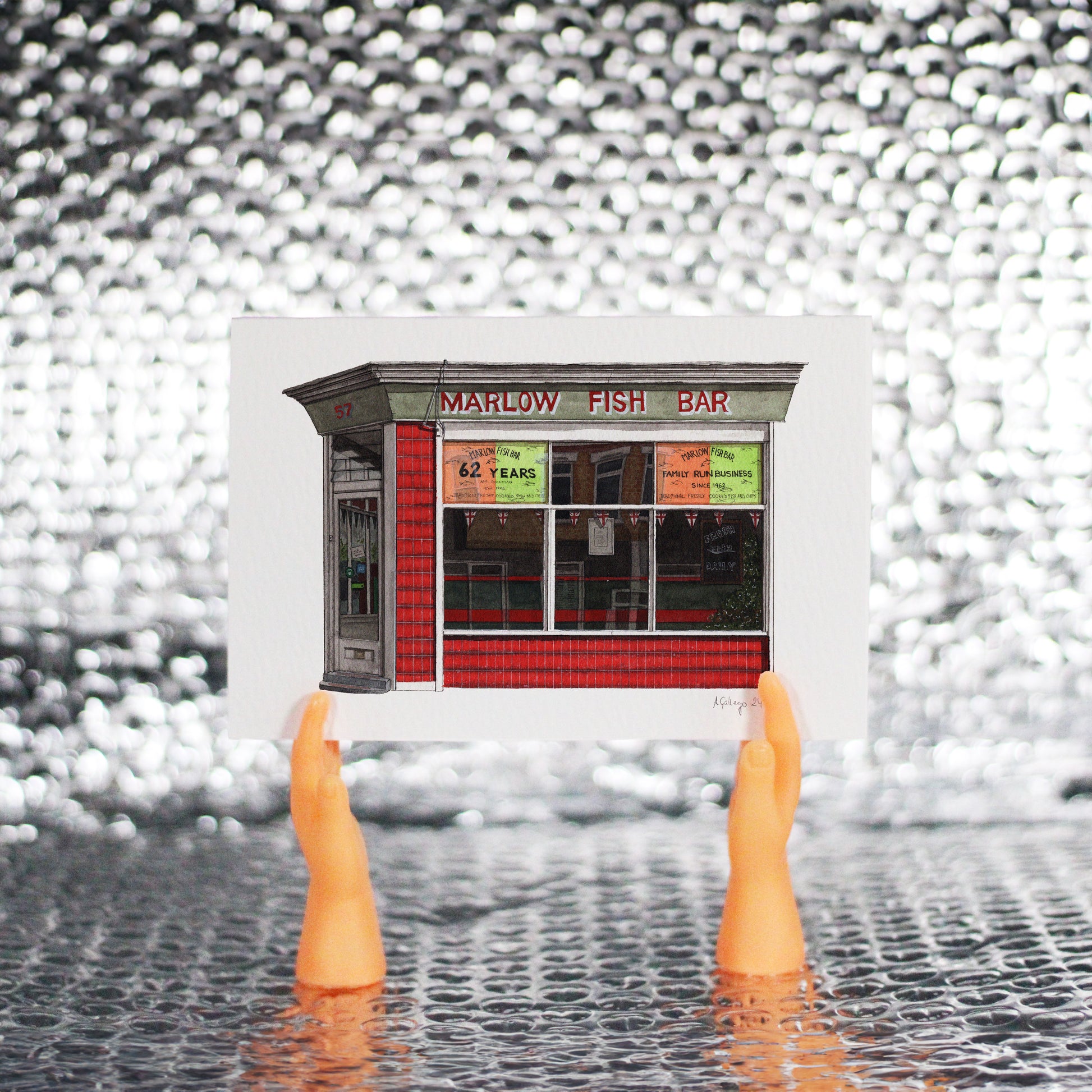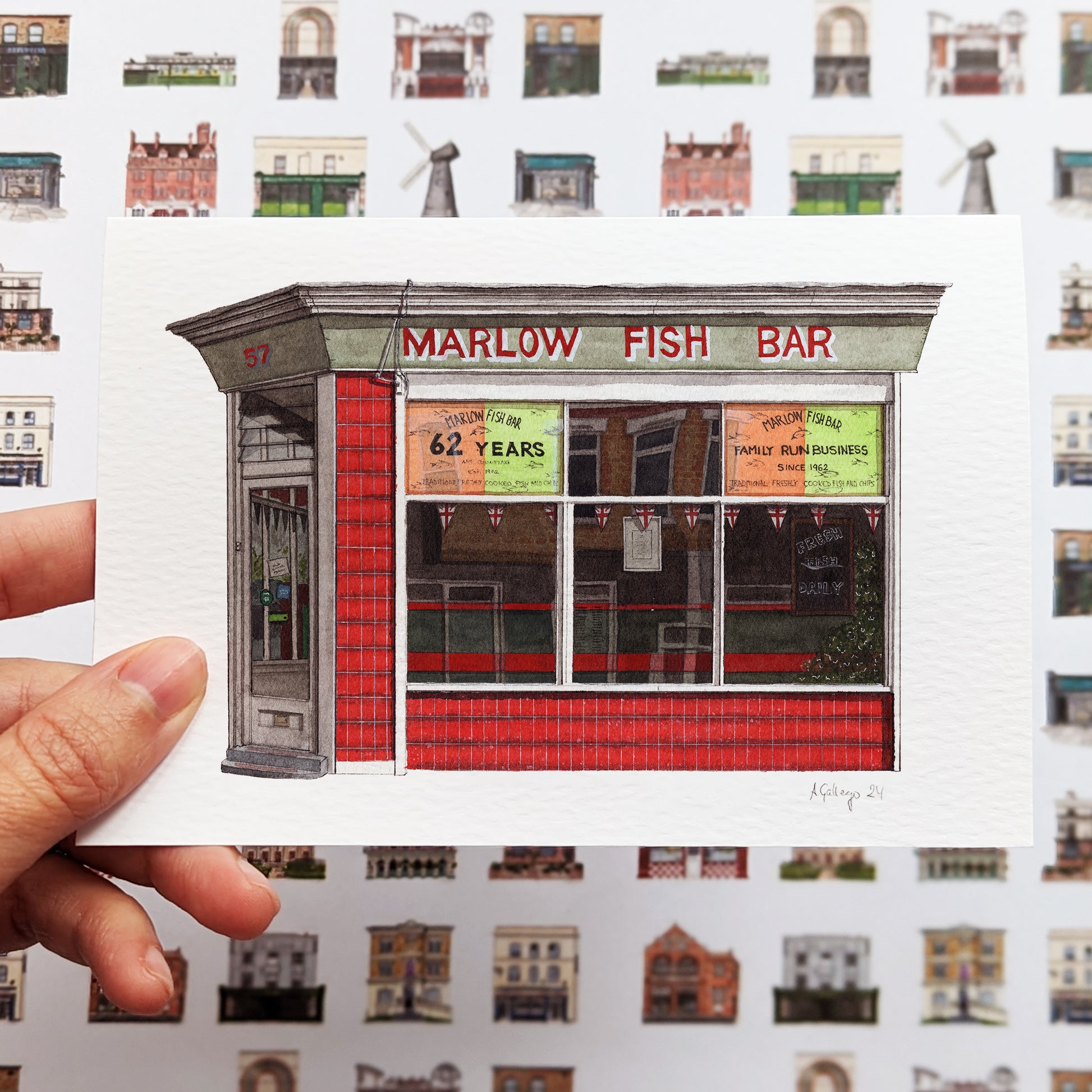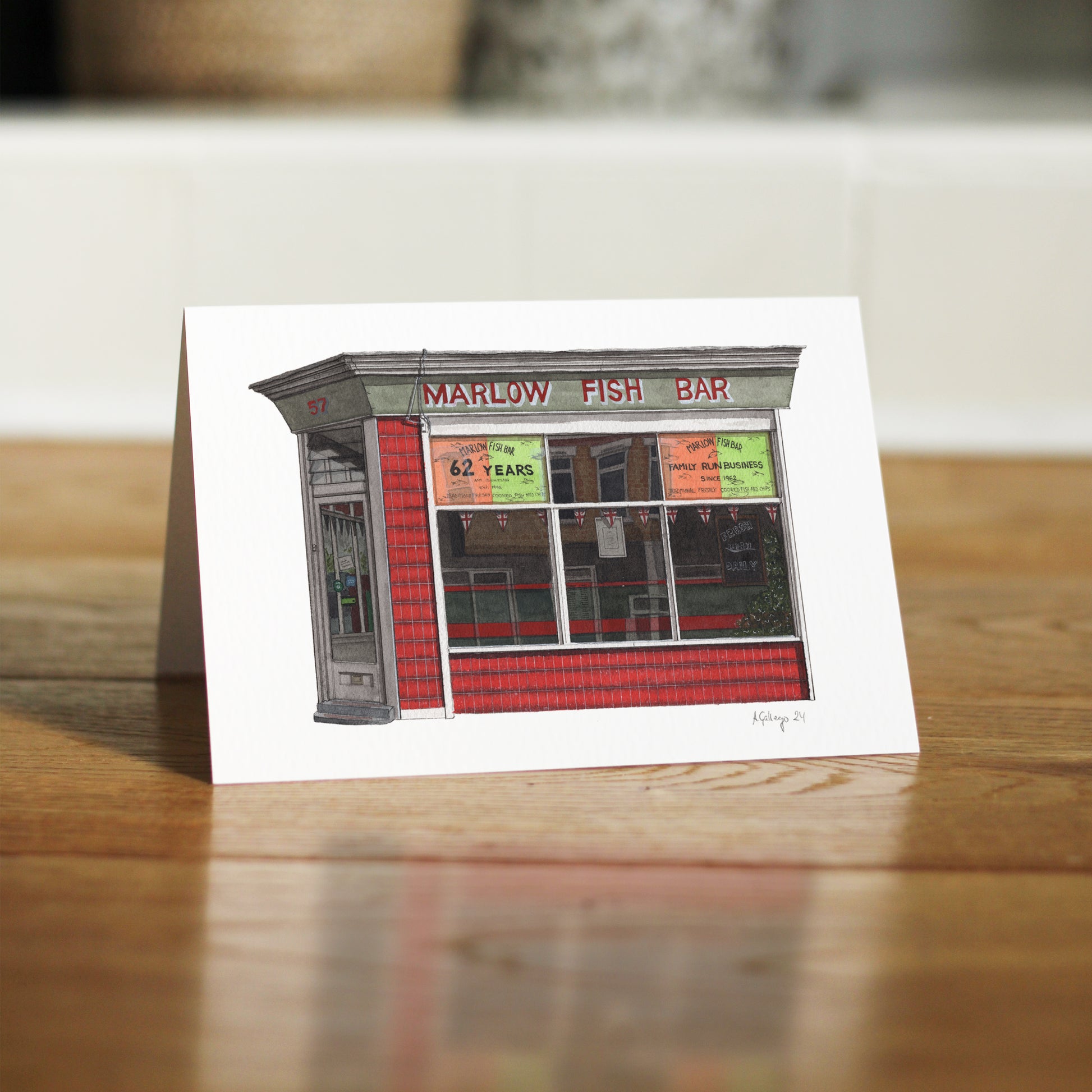This is a greeting card of a watercolour illustration painted by me of the Marlow Fish Bar in Penge, South East London.