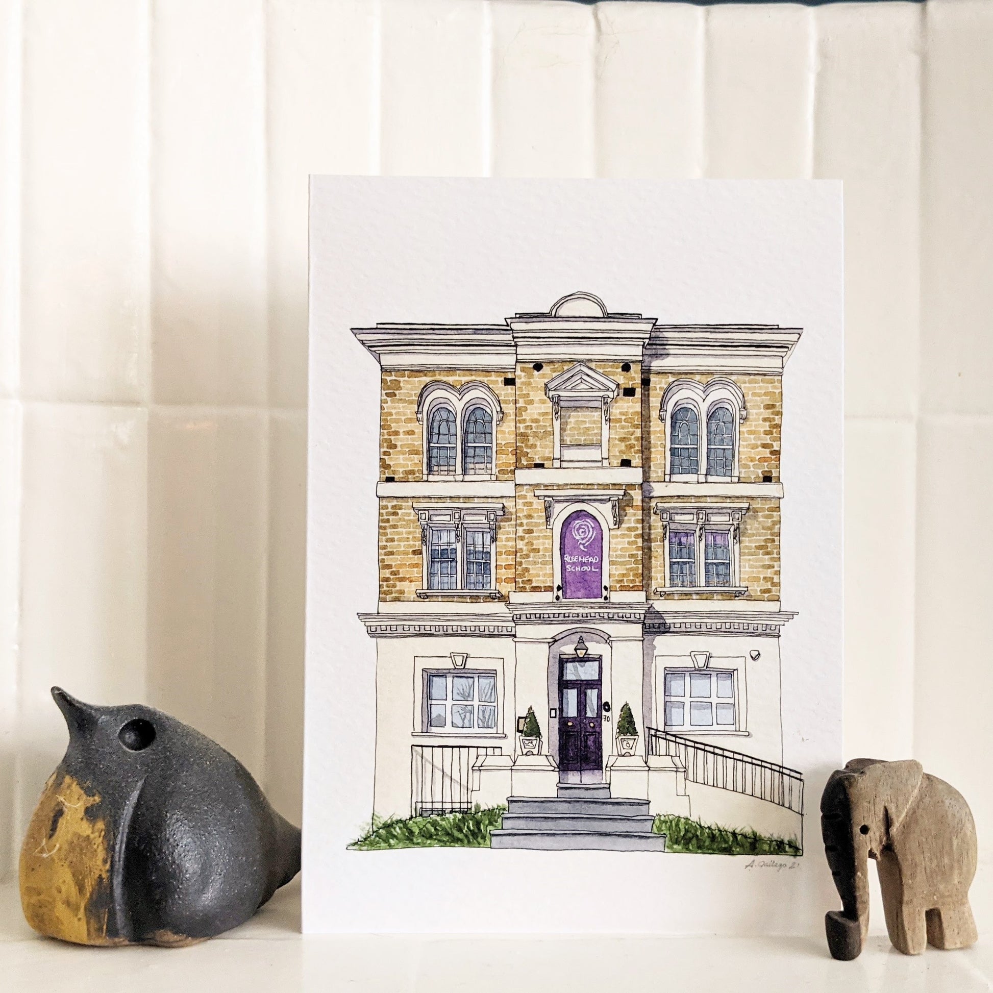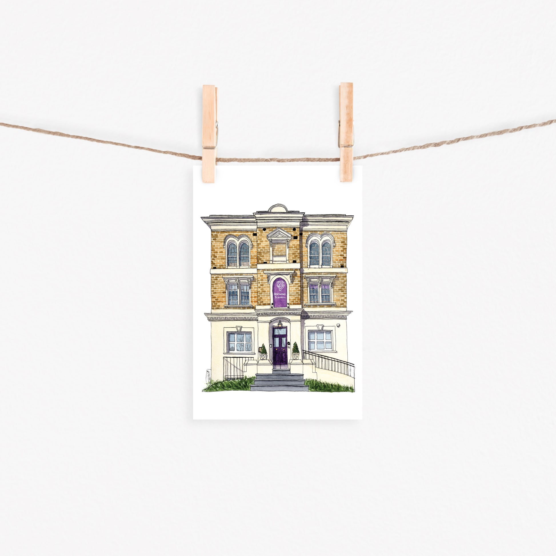 This is a Greeting Card with a digitally reproduced watercolour illustration painted by me of the iconic Rosemead Preparatory School in West Norwood / Tulse Hill (South London)