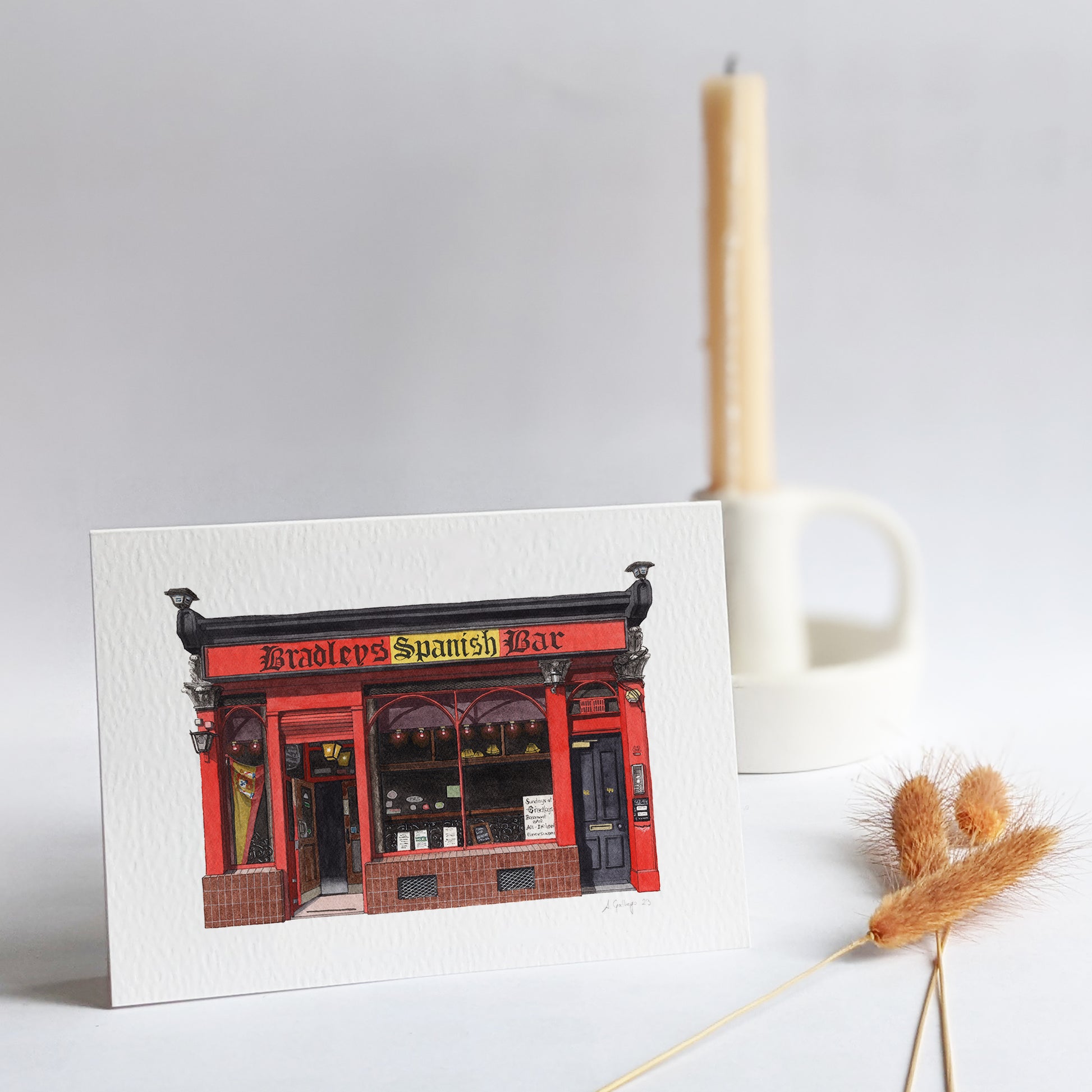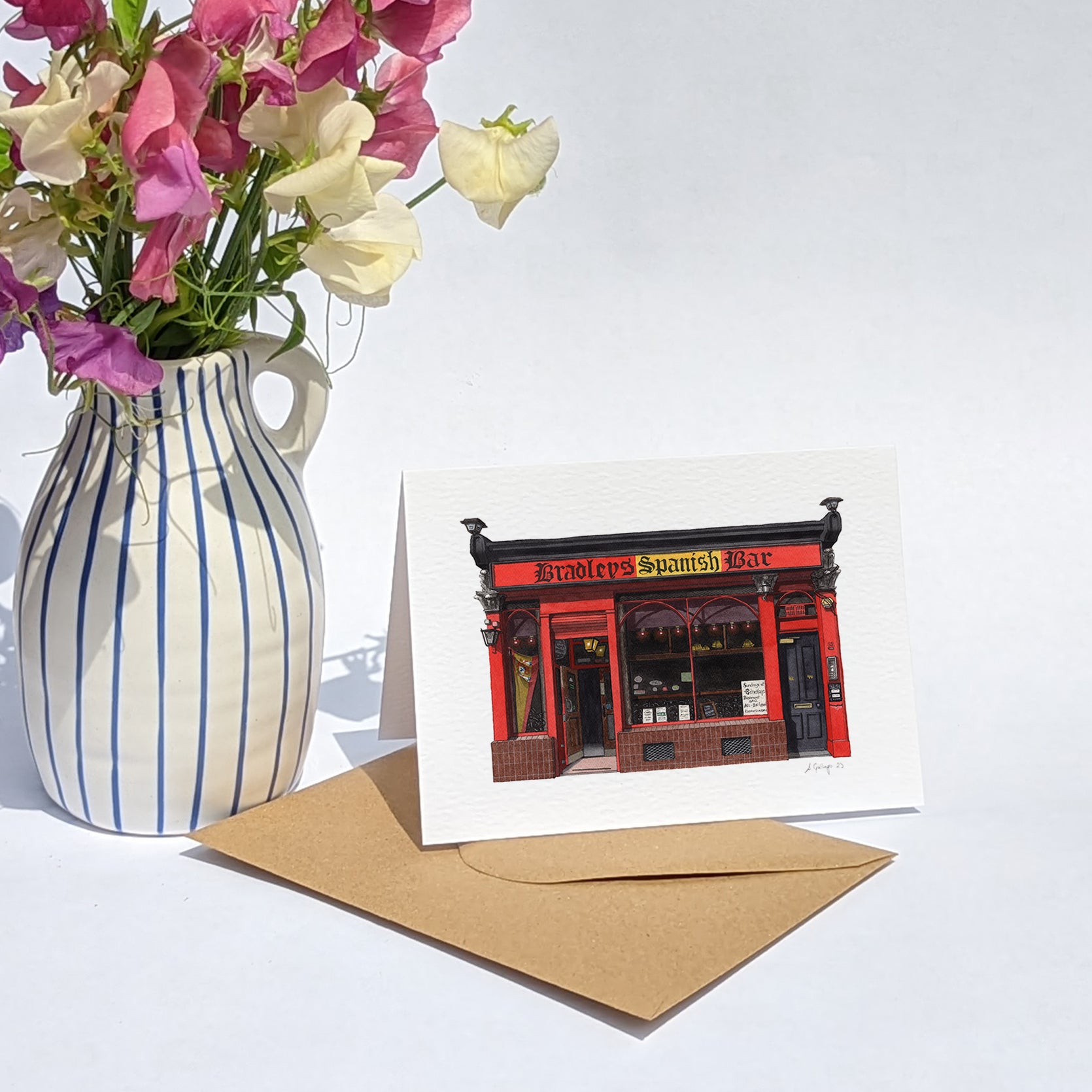 This is a greeting card of a watercolour illustration painted by me of Bradley's Spanish Bar in Soho, Central London.