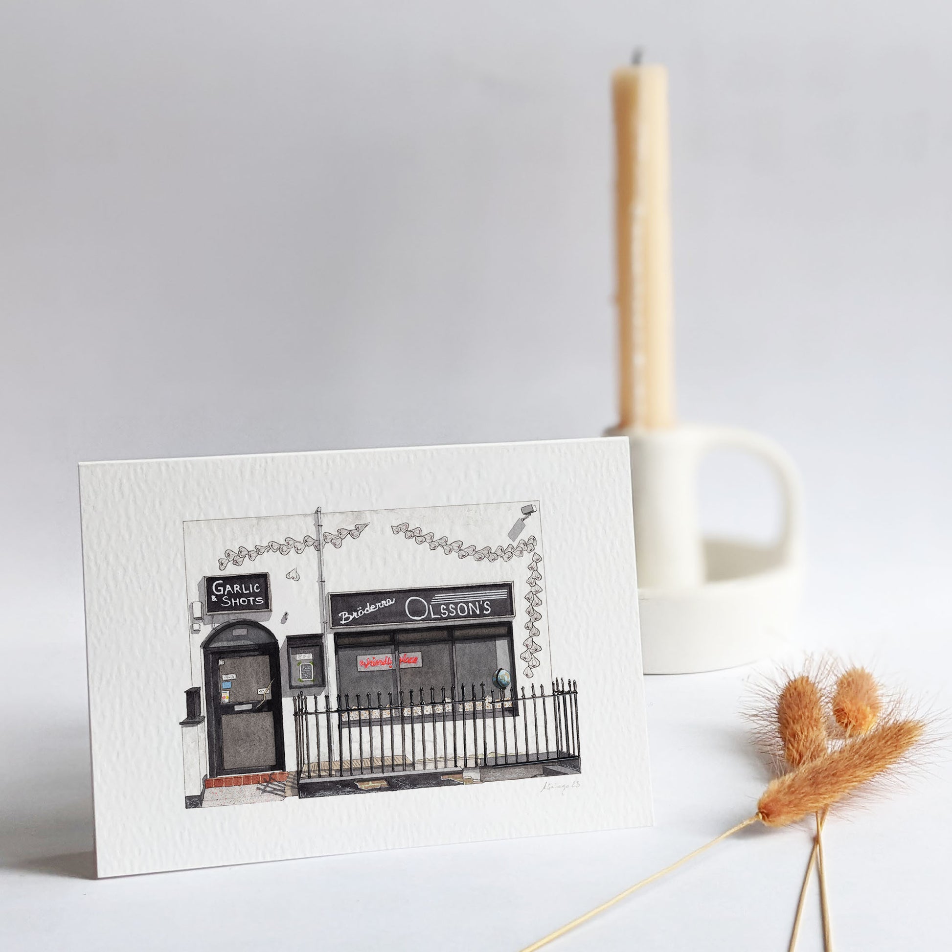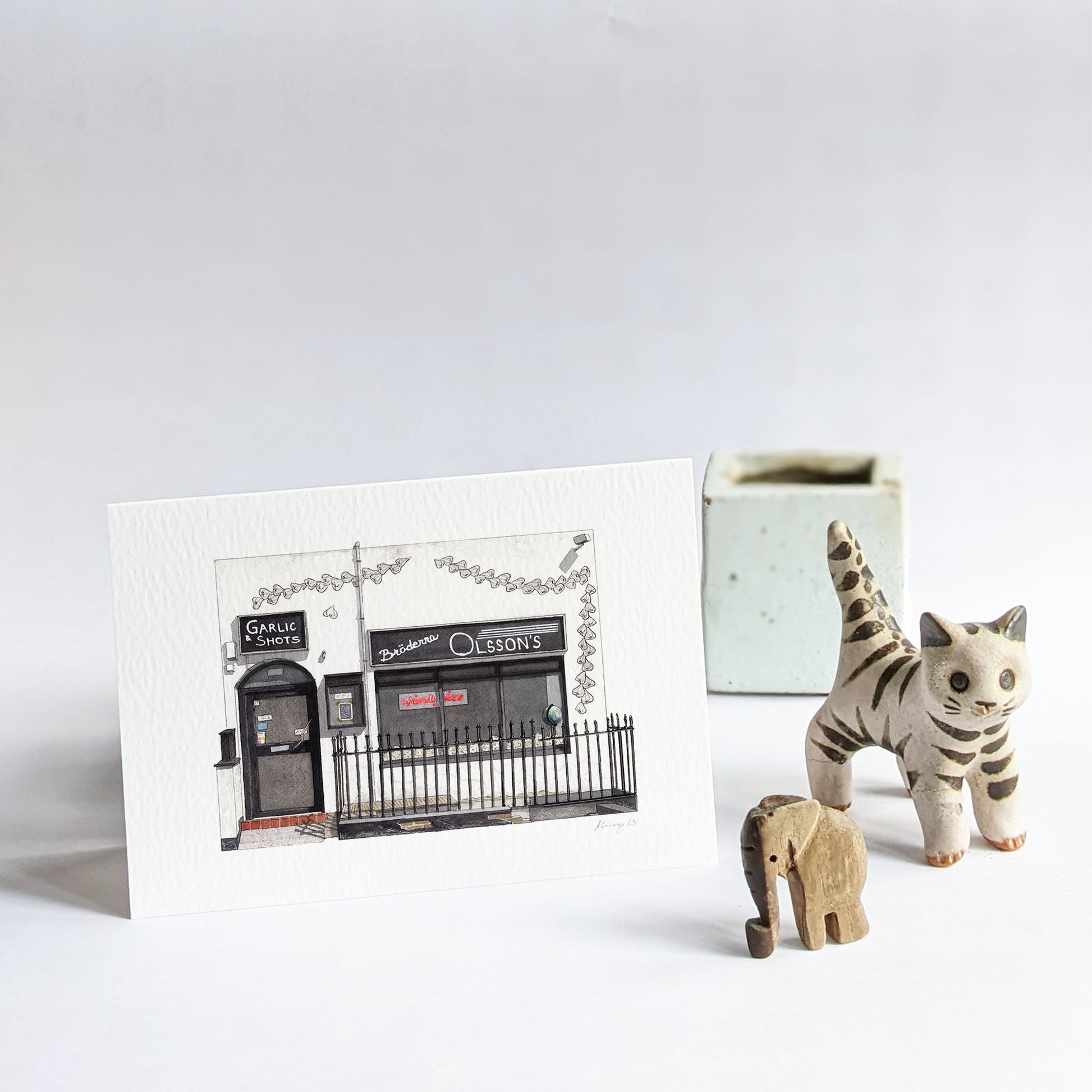 This is a greeting card of a watercolour illustration painted by me of Garlic & Shots, the metal goth Swedish bar Soho, Central London, founded in 1992.