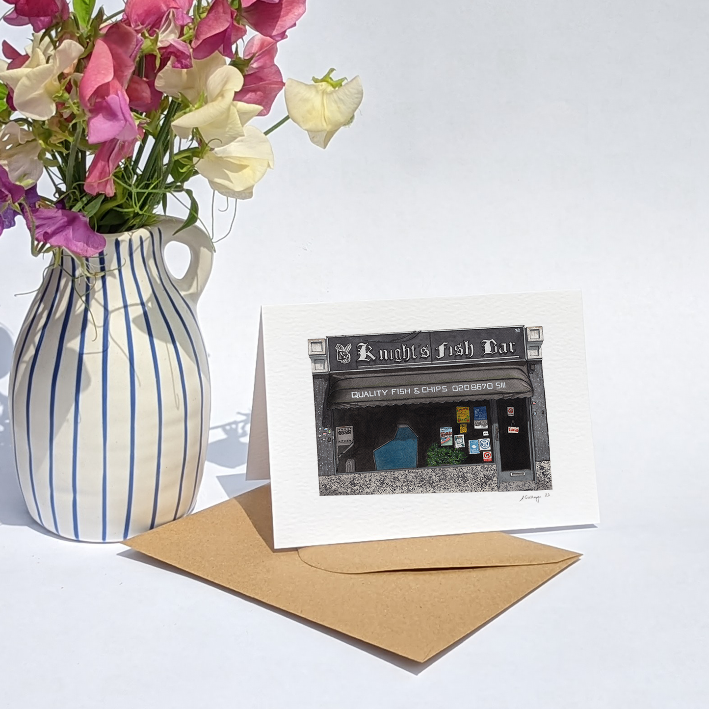 This is a greeting card of a watercolour illustration painted by me of Knight's Fish Bar bar, the fish & chips shop in West Norwood, South East London.